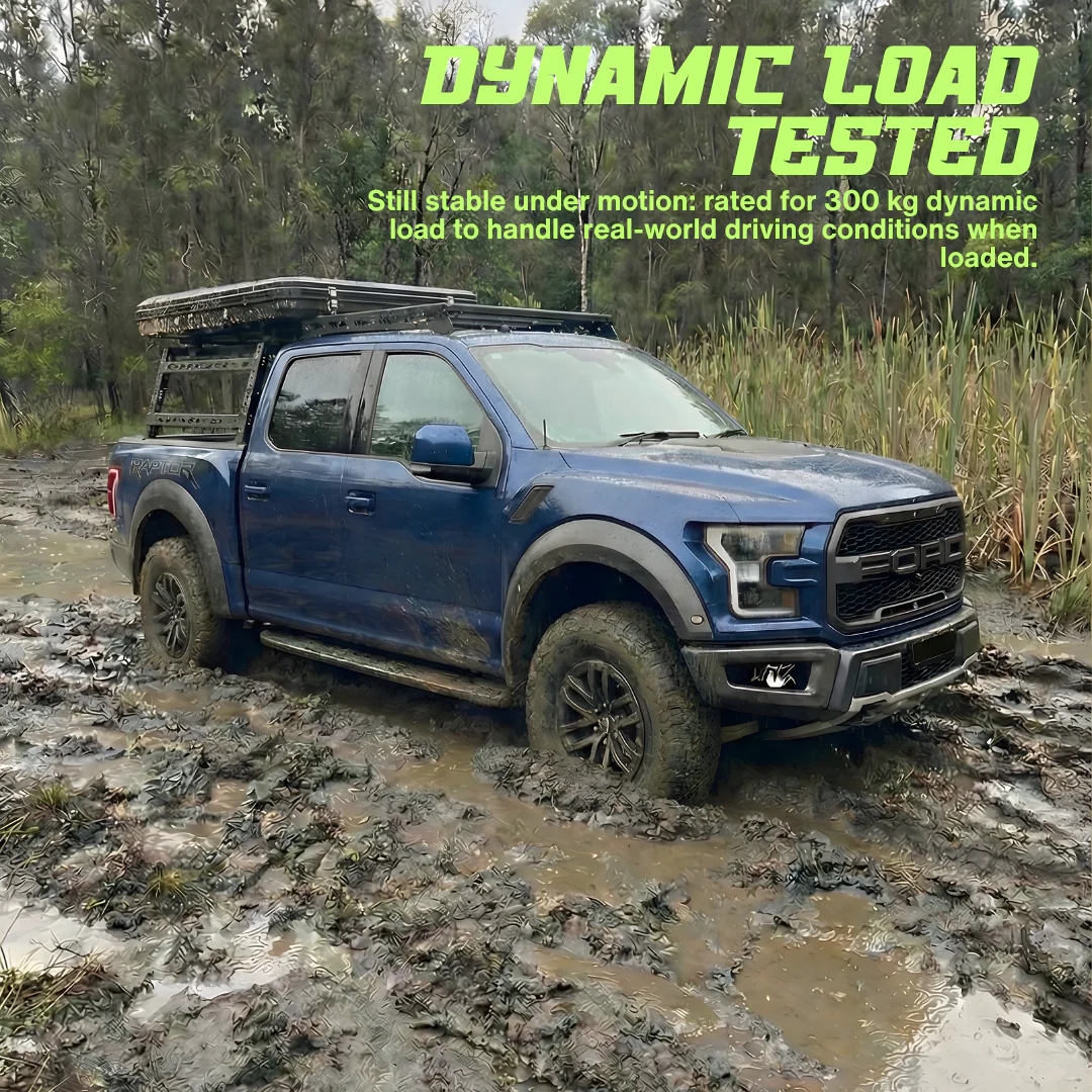 This is a heavy-duty adventure-ready mounting system designed to increase your ute's carrying capacity without losing strength or stability. It is built for touring, camping, weekend missions, beach trips, bush escapes and remote travel. It provides a reliable platform for rooftop tents, awnings, recovery gear, tools, boards, bikes, and more.